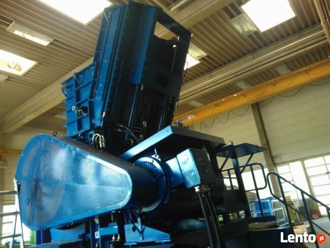 podnośnikiem. Sterowanie maszyną z szafy sterowniczej z pulpitem obsługi. Lej zasypowy z wbudowanym dociskiem hydraulicznym.